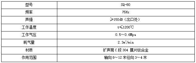 由于需依托聲響能量使反響器內(nèi)塵土顆粒發(fā)生振動而清灰,有必要選用特定頻率的某些聲強(qiáng),較低的頻率意味著有更大的清潔區(qū)域,具有更低頻率的聲波清灰設(shè)備可提供更大的有用清灰規(guī)劃。具體參數(shù)如下: