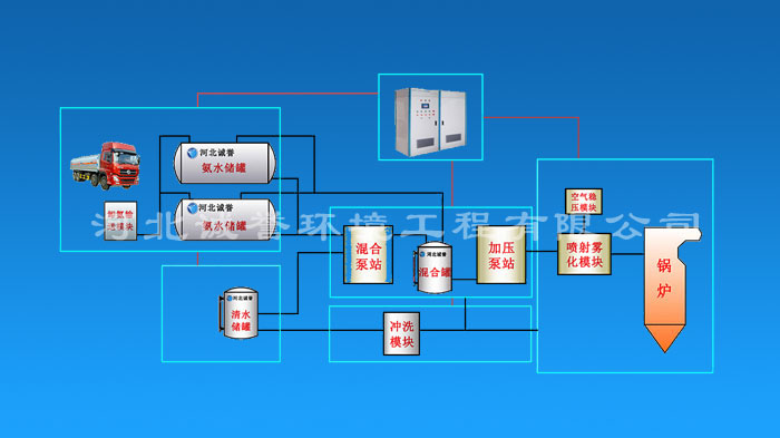 如此,即可確保氨水脫硝系統(tǒng)的安全性,才可使氨水最終順利進(jìn)入噴射霧化模塊,由氨水脫硝噴槍噴出,對(duì)鍋爐煙氣進(jìn)行脫硝處理。